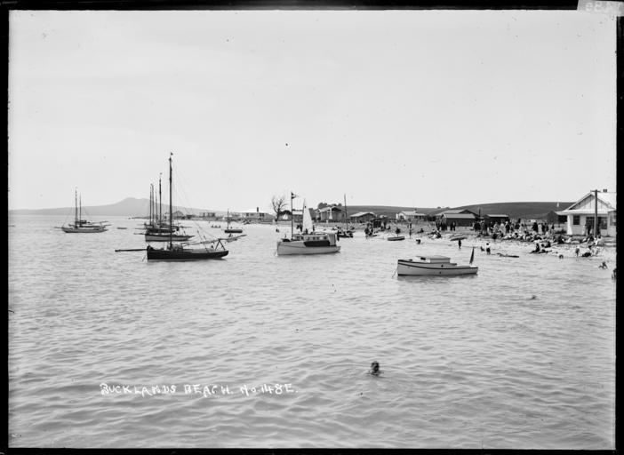 Keywords: blackandwhite monochrome photo border outdoor boat vehicle black and white View of Bucklands Beach taken on a summer's day from the sea looking towards the beach with Rangitoto Island in the distance. Yachts and launches are anchored close to shore and people are on the beach or walking along the seafront. Hindman's store is on the far right. A man is swimming close to the photographer in the foreground. Photograph taken by William Archer Price in early 1900s. Inscriptions: Inscribed - Photographer's title on negative -bottom left: Bucklands Beach. No 148E. William Archer Price lived and practised in Queen Street, Northcote, 1909-1910. Source: New Zealand Post Office directories Quantity: 1 b&w original negative(s). Physical Description: Dry plate glass negative 4.75 x 6.5 inches Leisure craft and holiday makers at Bucklands Beach, Auckland. Price, William Archer, 1866-1948 :Collection of post card negatives. Ref: 1/2-001285-G. Alexander Turnbull Library, Wellington, New Zealand. natlib.govt.nz/records/22680243 View of Bucklands Beach taken on a summer's day from the sea looking towards the beach with Rangitoto Island in the distance. Yachts and launches are anchored close to shore and people are on the beach or walking along the seafront. Hindman's store is on the far right. A man is swimming close to the photographer in the foreground. Photograph taken by William Archer Price in early 1900s. Inscriptions: Inscribed - Photographer's title on negative -bottom left: Bucklands Beach. No 148E. William Archer Price lived and practised in Queen Street, Northcote, 1909-1910. Source: New Zealand Post Office directories Quantity: 1 b&w original negative(s). Physical Description: Dry plate glass negative 4.75 x 6.5 inches Leisure craft and holiday makers at Bucklands Beach, Auckland. Price, William Archer, 1866-1948 :Collection of post card negatives. Ref: 1/2-001285-G. Alexander Turnbull Library, Wellington, New Zealand. natlib.govt.nz/records/22680243 |