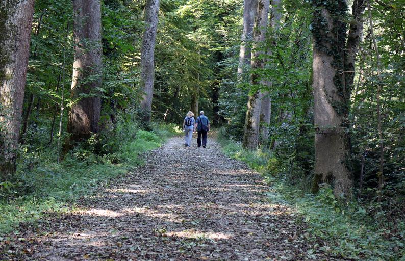 Keywords: leisure hobby hiking walk human pair man woman away nature forest forest path trees