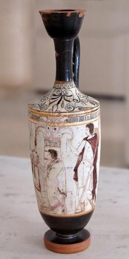 | Keywords: Lekythos Quadrate Painter Petit Palais ADUT00355.jpg Quadrate Painter Funeral scene on the left a woman sitting and holding a basket presents a crown to a funeral stele here unseen ; on the right a young man bearing a petasos travel hat holds a lance Attic white lekythos ca 440 “430 BC found in Athens Scène funéraire à gauche une femme assise porte un panier et présente une couronne à une stèle funéraire invisible sur la photo ; à droite un jeune homme coiffé du pétase chapeau de voyage tient une lance Lécythe attique à fond blanc v 440-430 av J -C découvert à Athènes Museum Petit Palais Room 34 The Greek world object history credit line Dutuit Bequest 1902 Legs Dutuit 1902 accession number Inv ADUT00355 Jastrow 2006 other versions Death in ancient Greece White-ground lekythoi Quadrate Painter Ancient Greek pottery in the Musée des Beaux-Arts de la Ville de Paris Dutuit Collection 440s BC pottery in France Paris 430s BC pottery in France Paris |