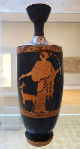 Keywords: Lekythos with Artemis pouring libation and faun, view 1, Oreithyia Painter, Greek, Attica, c. 470 BC, ceramic, red figure decoration - Chazen Museum of Art - DSC02700.JPG en Exhibit in the Chazen Museum of Art University of Wisconsin-Madison Madison Wisconsin USA This artwork is old enough so that it is in the public domain Photography was permitted in the museum without restriction 2013-07-21 14 34 54 own Daderot cc-zero Ancient Greek pottery in the Chazen Museum of Art Uploaded with UploadWizard Oreithyia Painter Shoulder lekythoi |