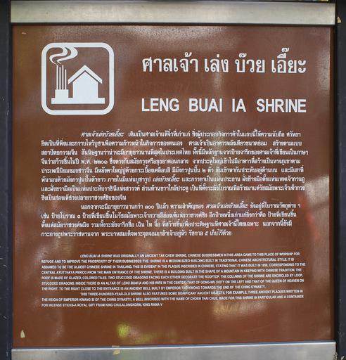Keywords: Leng buai ia shrine sign.jpg en Public information sign at Leng Bua Ia Shrine Bangkok Thailand own Alan Oscroft User Boing said Zebedee 2010-01-17 Leng Buai Ia Shrine