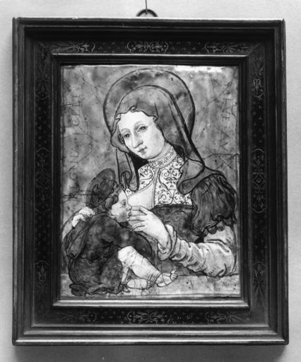 | Keywords: Léonard Limosin - Virgin and Child - Walters 4448.jpg The Virgin turned three-quarters towards the left is seen half-length behind a ledge on which the Child is seated She is suckling the infant Christ Her veil is blue with a gilt border The background is of a lighter blue inscribed in gilt letters REGINA CELI SALVE AVE Her nimbus is of a buff color as is the halo and hair of the Child enhanced with gilding Her bodice is white with a scroll-design painted in brownish-red Her dress is purple highlighted and decorated with scrolls in gold the sleeves turquoise-blue with highlights in white The garment of the Child is light green The ledge on which he sits is a mottled blue The design and the technical details of the dress ornaments delineated in red on opaque white or applied in gold on translucent enamel are related to pieces produced in the workshop of Léonard Limosin 2nd half Other date century 16 late Renaissance technique painted enamel copper cm 14 5 11 7 accession number 44 48 40269 Michel Boy Collection Sale Hotel Drouot Paris May 15 1905 no 205 Seligmann Brothers Paris date of acquisition unknown by purchase Henry Walters Baltimore date of acquisition unknown by purchase Walters Art Museum Henry Walters Acquired by Henry Walters inscribed in gilt letters along the sides REGINA CELI SALVE AVE place of origin Limoges France Walters Art Museum license Limoges painted enamels in the Walters Art Museum Léonard Limosin Media contributed by the Walters Art Museum needs artist update Painted enamel art in the Walters Art Museum Paintings of Madonna lactans |