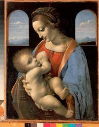 Keywords: Leonardo da Vinci - The Madonna and Child (The Litta Madonna).jpg LargeImage Attributed to Madonna Litta リッタの聖母 מדונה יטה адонна Литта พระแม่มารีให้นม адонна Літта ca 1490 oil panelcanvas cm 42 33 institution Hermitage Museum object history Litta Family<br /> ProvenanceEvent 1865 acquisition Alexander II of Russia Other versions <gallery> File Leonardo da Vinci attributed - Madonna Litta jpg Crop of scan corrected File Madonna Litta Hermitage jpg From arthermitage org </gallery> PD-old-100 Madonna Litta Women facing left in art