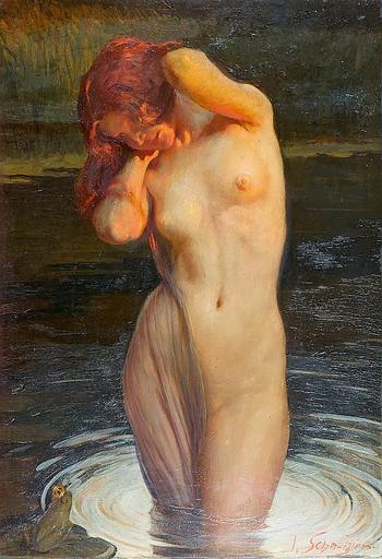 Keywords: Léopold Schmutzler - Froschkönig.jpg Artwork Creator Leopold Schmutzler de Unbekleidetes Mädchen sich in die roten Haare fassend in Wasserkreis vor kleinem auf Seerosenblatt sitzendem Frosch mit Krone Oil on Canvas Size cm 77 109 object history exhibition history credit line place of creation L Schmutzler lower right signature http //livre-d-art ml/post/85457362934/leopold-schmutzler-froschkönig-109-x-77-cm-oil livre-d-art ml https //65 media tumblr com/8c19c2c2d582be7ef58721141ed7c047/tumblr_n5fh8aXbKk1tb9edzo1_1280 jpg direct link https //lot-tissimo com/de/i/5982003/schmutzler-leopold-von-mies-muenchen-1864-1940-froschkoenig-unbekleidetes-maedchen-sich-in-die-roten lot-tissimo com accession number PD-old-auto 1940 Frog Prince Paintings of nude women standing in water outdoors Nude or partially nude women facing left and looking down in art People with water in art Paintings of women with long hair Nude women with red hair in art Transparent clothing in art Water-lilies in art Paintings of lakes Reed beds Leopold Schmutzler |