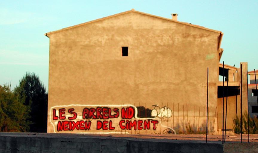 Keywords: Les arrels no neixen del ciment.JPG Obres paralitzades a Ses Covetes Apartments construction without permission Place Lloc/Place Ses Covetes Per / By Chixoy Data / Date 2007-06-01 Font Vaig fer la foto jo mateix Source Photo taken by uploader 39 354238 2 973065 region ES_heading N Ses Covetes Urban sprawl in Mallorca Graffiti in the Balearic Islands
