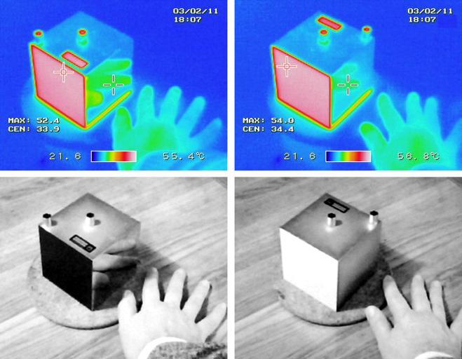 | Keywords: LesliesCube.png Thermal images of two faces of Leslie's cube taken with an infrared camera compared with conventional black white photographs of the cube The four faces of the cube are at the same temperature The face that has been painted black emits thermal radiation strongly The polished face of the aluminum cube emits much more weakly and the reflected image of the experimenter's warm hand is clear This cube is made by 3B Scientific Inc See cite web Leslie's Cube - Instruction Sheet http //www 3bscientific com/product-manual/U8442835_EN pdf January 2011 2014-08-01 own Pieter Kuiper 2011-02-11 Photos taken with NEC Thermo Shot Thermal images |