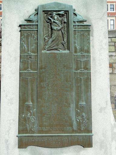 Keywords: Lest We Forget detail - World War I Memorial - Marlborough, MA - DSC04377.JPG A figure of a World War I soldier with his head bowed and a cross used to mark soldiers graves in his proper right hand At his feet are a helmet and barbed wire The sculpture stands atop a stone base that is adorned with bronze inscription plaques featuring allegorical figures of Peace Inscription John Hardy Around bronze base of sculpture WORLD WAR/LEST WE FORGET/1914-1919 On bronze plaque on front of base list of names / TO YOU FROM FAILING HANDS WE THROW/THE TORCH BE YOURS TO BEAR IT HIGH /MARLBOROUGH HONORS HER HERO DEAD/1923 signed Daderot 2012-02-20 11 05 20 Daderot cc0 cc0 Lest We Forget by John G Hardy |