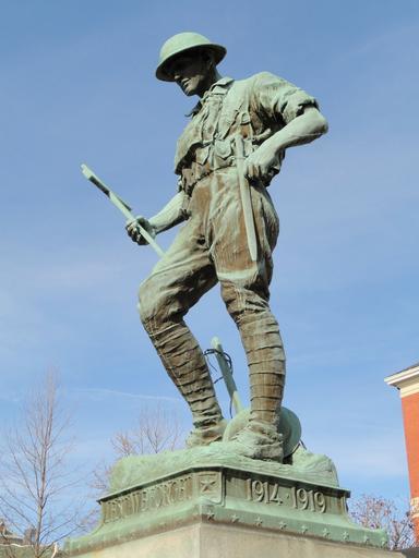 Keywords: Lest We Forget - World War I Memorial - Marlborough, MA - DSC04383.JPG A figure of a World War I soldier with his head bowed and a cross used to mark soldiers graves in his proper right hand At his feet are a helmet and barbed wire The sculpture stands atop a stone base that is adorned with bronze inscription plaques featuring allegorical figures of Peace Inscription John Hardy Around bronze base of sculpture WORLD WAR/LEST WE FORGET/1914-1919 On bronze plaque on front of base list of names / TO YOU FROM FAILING HANDS WE THROW/THE TORCH BE YOURS TO BEAR IT HIGH /MARLBOROUGH HONORS HER HERO DEAD/1923 signed Daderot 2012-02-20 11 06 29 Daderot cc0 cc0 Lest We Forget by John G Hardy |