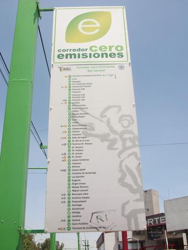 | Keywords: Letrero corredor cero emisiones.jpg es Letrero con las estaciones del Corredor Cero Emisiones de Norte a Sur Sign giving list of stations stops on Mexico City's Zero-Emissions Corridor trolleybus line own GAED 2009-11-09 Mexico City trolleybus system |