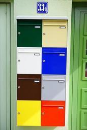 Keywords: letter boxes colorful color post house number yellow red blue green grey brown white