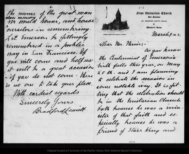 | Keywords: Letter Bradford Leavitt to John Muir.jpg en Letter from Rev Bradford Leavitt of San Francisco's First Unitarian Church to conservationist John Muir with Leavitt extending an invitation to Muir to help celebrate the centennial of Ralph Waldo Emerson's birth at the church where Leavitt was the minister the name of the great man whose memory we would honor and honor ourselves in remembering Let Emerson be fittingly remembered in a public way in San Francisco If you will come and help us it will be a great occasion - if you do not come - there is no one to take your place With cordial regards Sincerely Yours Bradford Leavitt 1 letterhead March 9 1903 Dear Mr Muir - As you know the Centennial of Emerson's birth falls this year on May 25th and I am planning to celebrate the occasion in some notable way it is fitting that the celebration should be in the Unitarian Church both because he was a minister of that faith and especially because he was a friend of Starr King Courtesy of the University of the Pacific University of California Calisphere http //content cdlib org/ark /13030/kt5g50352f/ query leavitt brand calisphere Bradford Leavitt 1903-03-09 PD-old John Muir Manuscript letters written messages |