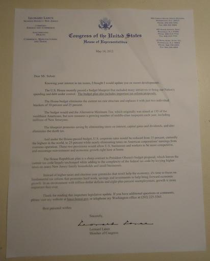 Keywords: Letter from congressperson Leonard Lance to me using franking privilege.jpg franking privilege which means they can send free letters to constituents without having to pay for postage The initial idea was to enable communication between legislators and the public; today it is essentially free advertising unavailable to challengers Staffers for my congressperson Leonard Lance found my name on a database of citizens interested in tax reform and as a result I got this form letter I do not vote for Republicans or Democrats any longer This letter is a publication of the United States government 2012-08-16 own Tomwsulcer cc-zero Uploaded with UploadWizard 2012 in New Jersey 2012 texts Letters written messages Leonard Lance |
