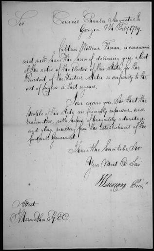 | Keywords: Letter of T. Lauson, President of the Council Chamber, transmitting a list of the votes for President by the electors of - NARA - 306214.tif Local identifier U S Senate 03/04/1789 - Center for Legislative Archives NWL National Archives Building Room 8E 7th and Pennsylvania Avenue NW Washington DC 20408 1789-02-08 Record group Record Group 46 Records of the U S Senate 1789 - 2011 Record group ARC 375 Credentials compiled 1789 - 1998 Series ARC 306203 Variant control numbers NAIL Control Number NWL-46-ELECTION-1AH1-9 General notes Scope and content File unit File unit ARC yes <gallery> File Letter of T Lauson President of the Council Chamber transmitting a list of the votes for President by the electors of - NARA - 306214 tif TIFF File Letter of T Lauson President of the Council Chamber transmitting a list of the votes for President by the electors of - NARA - 306214 jpg JPEG </gallery> NARA-cooperation PD-USGov derivative works Hugh Lawson signature jpg James Meriwether signature jpg 1789 documents Documents in English Documents of the United States Manuscripts NARA TIF images with categorized JPGs |