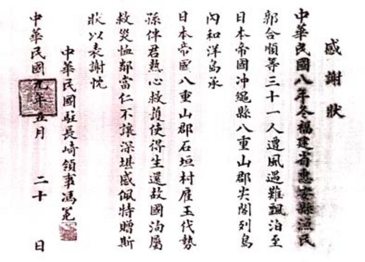 | Keywords: Letter of thanks from ROC consul to Ishigakijima in 1920.jpg Letter of thanks from Republic of China consul resident in Nagasaki to Ishigakijima in 1920 In this letter the consul of ROC thanked for saving Fujian fishermen who met with a disaster then were cast ashore in Senkaku Islands And he recognized that Senkaku Islands were the territories of Japan Provisional translation by Ministry of Foreign Affairs of Japan In the winter of the 8th year 1919 of the Republic of China 31 fishermen from Hui'an Country Fujian Province were lost due to the stormy wind and were washed ashore on the Wayo Island of the Senkaku Islands Yaeyama District Okinawa Prefecture Empire of Japan Thanks to the enthusiastic rescue work by the people of Ishigaki village Yaeyama District Empire of Japan they were able to safely return to their homeland With a deep response and admiration toward the people of the village who were willing and generous in the rescue operation I express my gratitude by this letter Consul of the Republic of China in Nagasaki Feng Mien 20 May the 9th year 1920 of the Republic of China 尖閣諸島に漂 した福建 漁民を救助したことに対して 中華民国駐長崎領事・馮冕から石垣島島民に贈られた感 状 http //www geocities jp/tanaka_kunitaka/senkaku/testimonial1920 jpg<br> See alternate source http //ryukyushimpo jp/news/storyid-3159-storytopic-1 html 尖閣は日 の領 遭難救助の中国政 感 状に明記 'Senkaku is Japanese territory ' stated a letter of thanks distress and safety of the Chinese government Ryukyu Shimpo June 15 2005 9th year of Minguo calendar 1920 May 20 中華民国9年(1920年)5 20日 中華民国駐長崎領事・馮冕 Documents of Senkaku Islands Diplomacy Letters of China Certificates of appreciations PD-China PD-Japan |