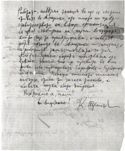 | Keywords: Letter to Radulov 26 December 1903 - Page from Kiril Parlichev.png en Letter from Kiril Parlichev Писмо от Ки ил Пъ личев до Иван Радулов 26 декемв и 1903 година Текст Разб а наве но знаеш в що се състои отивате в Аме ика от името на п едставителството на вът о ганизация с цел съби ане на па и Докто ът който ще те п ид ужава е твъ де доб е познат в Аме ика и запознат с аботите там; почвата за тая цел съби ане на па и е подготвена от в еме Значи вие ще п авите в Аме ика това що п ават Са афов и Ге джиков в Англия Понеже писмото пишем набъ зо стига ти за сега толкова а повече тука като дойдеш Разб ахме се нали До виждане К Пъ личев 1903-12-26 http //dedolazko blogspot com/ Kiril Parlichev other versions Custom license marker 2015 01 22 PD-old Uploaded with UploadWizard Kiril Parlichev Ivan Radulov |