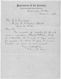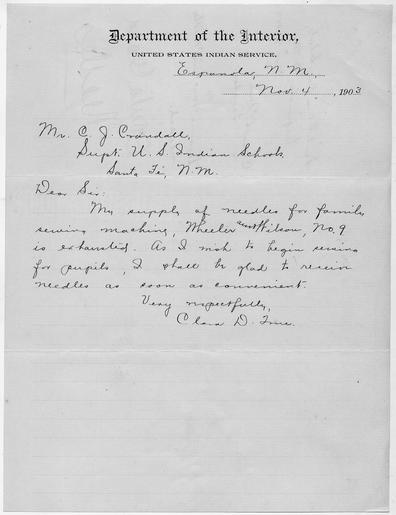 Keywords: Letter to Superintendent concerning the need for sewing machine needles. - NARA - 293237.tif Scope and content Letter to Supt Crandall from Miss True concerning her need for sewing machine needles so she can begin sewing for her pupils General notes 293237 Local identifier Department of the Interior Bureau of Indian Affairs Santa Fe Indian School Santa Clara Day School - NARA-Author True Clara D Author 8467825 <br /> New Mexico United States North and Central America state 4191641 35 -105 <br /> NARA's Rocky Mountain Region Denver NRGA Building 48 Denver Federal Center West 6th Avenue and Kipling Street Denver CO 80225-0307 1903-11-04 Record group Record Group 75 Records of the Bureau of Indian Affairs 1793 - 1999 Record group ARC 404 Letters Received from Day School Teacher Clara D True compiled 08/29/1902 - 09/17/1906 Series ARC 293139 File unit File unit ARC Variant control numbers NAIL Control Number NRG-75-E38-C19031104B yes Other versions NARA-cooperation PD-USGov United States Department of the Interior |