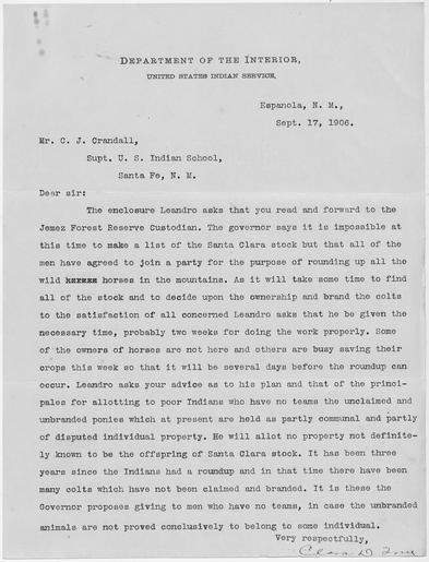 | Keywords: Letter to Superintendent concerning the roundup of wild horses. - NARA - 293325.tif Scope and content Letter to Supt Crandall from Miss True from the governor of the Santa Clara Pueblo Leandro Naranjo informing the superintendent that they are going to conduct a roundup of horses on the Indian lands determine ownership and brand colts Some of the horses will be given to poorer Indians without teams General notes 293325 Local identifier Department of the Interior Bureau of Indian Affairs Santa Fe Indian School Santa Clara Day School - NARA-Author True Clara D Author 8467825 <br /> New Mexico United States North and Central America state 4191641 35 -105 <br /> NARA's Rocky Mountain Region Denver NRGA Building 48 Denver Federal Center West 6th Avenue and Kipling Street Denver CO 80225-0307 1906-09-17 Record group Record Group 75 Records of the Bureau of Indian Affairs 1793 - 1999 Record group ARC 404 Letters Received from Day School Teacher Clara D True compiled 08/29/1902 - 09/17/1906 Series ARC 293139 File unit File unit ARC Variant control numbers NAIL Control Number NRG-75-E38-F19060917 yes Other versions NARA-cooperation PD-USGov United States Department of the Interior |
