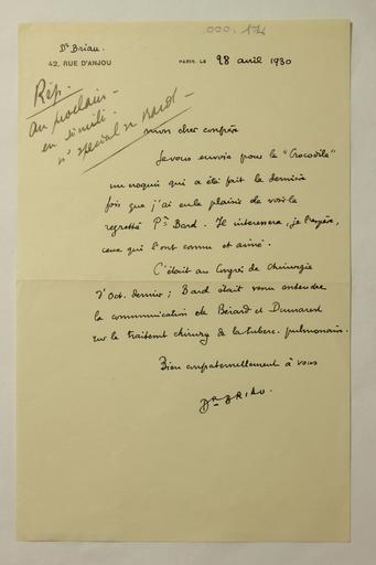 Keywords: Lettre d'Eugène Briau au docteur Jean Duclos à propos d'une caricature du Professeur Bard.JPG fr 2007 0 176 M 282 2014-04-16 10 10 56 Hospices civils de Lyon Laura Clerc et Maxence Colleau other versions Hospices civils de Lyon 2007 0 176 M manuscrit caricature lettres correspondance lettre au docteur Jean Duclos à propos d'une caricature du professeur Louis Bard BRIAU Eugène auteur Eugène Briau 1870-1951 Reçu au concours de l ™Internat en 1892 Médecin demeurant 42 rue d ™Anjou à Paris Dessinateur collectionneur il utilise les moments libres pour recueillir les caricatures de ses collègues Il collabore aux Revues de l'Internat de Lyon dès 1894 Une correspondance avec Jean Duclos nous apprend que c'est grâce à lui qu'a pu être constitué et conservé le premier album de la salle de garde de l'Hôtel-Dieu Après ses études lyonnaises il fut médecin au Creusot puis s'intalla à Paris Il fait partie du groupe des médecins hygiénistes et est membre du comité de rédaction du Mouvement Sanitaire où il publie régulièrement des articles agrémentés de savoureux croquis papier encre noire 28 avril 1930 adresse ; date à l ™angle supérieur gauche 42 rue d ™Anjou ; à droite Paris le 28 avril 1930 L 21 cm ; l 13 4 cm 2007 0 173 M croquis du Professeur Bard qui fait l ™objet de ce courrier UI 03/2001 propriété de l'établissement public ; don ; Lyon ; Musée des Hospices Civils de Lyon DUCLOS Jacques Donateur Laura Clerc Maxence Colleau Institution Musée des Hospices civils de Lyon Philippe PAILLARD L ™humour médecin Caricatures du monde médical lyonnais 1890-1950 Lyon Editions lyonnaises d ™Art et d ™Histoire 2003 67-68 DEFAULTSORT Bard cc-by-sa-4 0 PD-Art Caricature in Musée des Hospices civils de Lyon Caricatures of physicians 19th-century physicians from France Male physicians Physicians from France Physicians from Lyon People of Hospices civils de Lyon Louis Bard Eugène Briau Letters written messages |