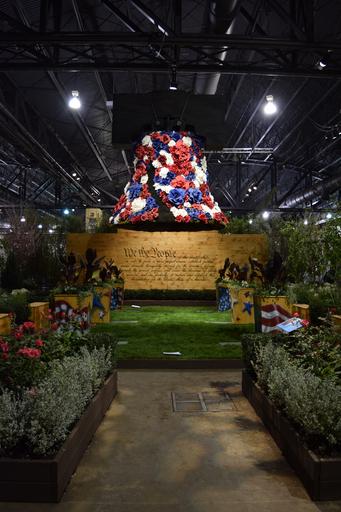 Keywords: A tree-lined lawn leads your eye up to the Liberty Bell suspended above. A rustic wall with an excerpt from the U.S. Constitution inscribed on it makes the perfect backdrop for this patriotic garden.