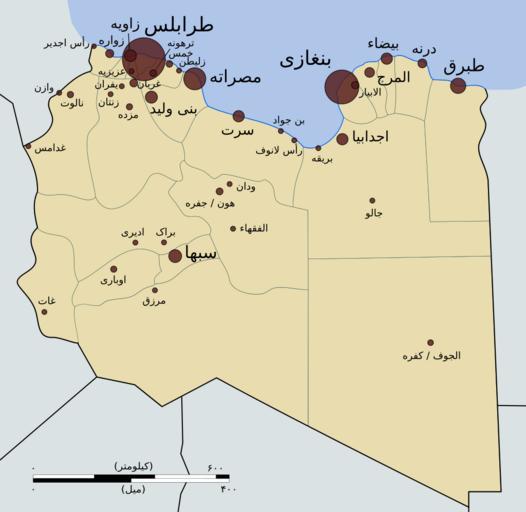| Keywords: Libyan Uprising-fa.svg شهرهای نشان داده شده طرابلس، بنغازی، مصراته، سرت، و ادیری، اجدابیا، الابیار، الجوف، المرج، اوباری، العزیزیه، بنی ولید، بیضاء، بن جواد، بریقه، درنه، غدامس، غریان، غات، هون، جالو، خمس، کفره، مزده، مرزق، نالوت، رأس اجدیر، رأس لانوف، سبها، ترهونه، طبرق، وازن، یفران، زاویه، زنتان، زلیطن، زواره Libyan uprising fa 0000ff Libyan_Uprising svg Based on Libyan_Uprising svg derivative work ZxxZxxZ Other versions/Libyan Uprising Persian translation ZxxZxxZ Libyan_Uprising svg Translation possible Inkscape Cc-zero Maps of the 2011 Libyan civil war SVG maps in Persian Maps showing history in Persian |