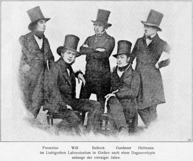 Keywords: Liebig Lab Anf1843.jpg Privatassistenten bei Liebig in Gießen Carl Remigius Fresenius 28 Dezember 1818 in Frankfurt am Main; 11 Juni 1897 in Wiesbaden Heinrich Will 8 Dezember 1812 in Weinheim; 15 Dezember 1890 in Gießen John Lloyd Bullock 1814 4 Juni 1905 http //www ncbi nlm nih gov/pmc/articles/PMC2320819/ page 1http //books google de/books id e4G7AAAAIAAJ pg PA51 lpg PA51 dq john+gardner+Pharmacologist source bl ots 0x4frvZ3WY sig sGGK9W4Nn5RDYgHiuQObNHZesJ0 hl de sa X ei GoQeVKK1KsmkPeyYgOgM ved 0CEwQ6AEwBg v onepage q john 20gardner 20Pharmacologist f false John Gardner 1804 1880 http //books google de/books id e4G7AAAAIAAJ pg PA51 lpg PA51 dq john+gardner+Pharmacologist source bl ots 0x4frvZ3WY sig sGGK9W4Nn5RDYgHiuQObNHZesJ0 hl de sa X ei GoQeVKK1KsmkPeyYgOgM ved 0CEwQ6AEwBg v onepage q john 20gardner 20Pharmacologist f false August Wilhelm von Hofmann 8 April 1818 in Gießen; 5 Mai 1892 in Berlin http //sceti library upenn edu/sceti/smith/scientist cfm PictureID 2139 ScientistID 1342 CFID 10283916 CFTOKEN 14242042 1843 author PD-old ImageNote 1 1709 2165 262 56 2858 2383 2 John Gardner ImageNoteEnd 1 ImageNote 2 1359 2161 203 52 2858 2383 2 John Lloyd Bullock ImageNoteEnd 2 ImageNote 3 962 965 44 44 2858 2383 2 Heinrich Will ImageNoteEnd 3 Carl Remigius Fresenius 1843 Heinrich Will chemist 1843 John Lloyd Bullock 1843 John Gardner 1843 August Wilhelm von Hofmann 1843 Group portraits with 5 persons Men with top hats 1840s Top hats in black and white photographs 1840s fashion |