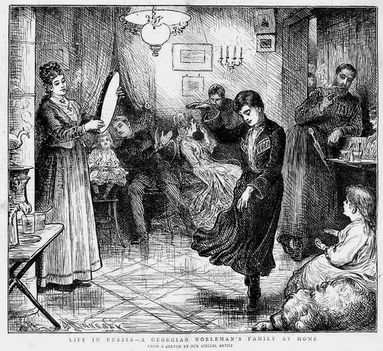 | Keywords: Life in Russia - Georgian nobleman's family at home. The Graphic, 1874.JPG en A Georgian noble family from the Imperial Russian times as illustrated in the 1874 edition of the British weekly The Graphic 1874 http //www amazon com/Russia-Georgian-Nobleman-Rothschild-Portarlington/dp/B001JSSF0E The Graphic An Illustrated Weekly Newspaper Unknown original text credits special artist of the newspaper other versions Custom license marker 2015 07 06 PD-Old-70 Uploaded with UploadWizard The Graphic 1874 Nobility of Georgia in art Dance in art Smoking in art |