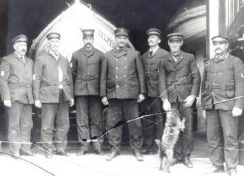 | Keywords: Life saving station crew and boat house.jpg Life saving station crew location and date unknown damaged glass plate photograph http //www uscg mil/history/uscghist/USLSS_Uniform_Photos asp U S Coast Guard Historian Author Federal government work unknown United States Life-Saving Service United States Life-Saving Service oar-powered surfboats PD-USGov |