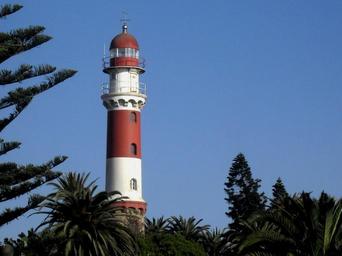 Keywords: lighthouse red white tall tapered green trees blue sky clear day outdoors