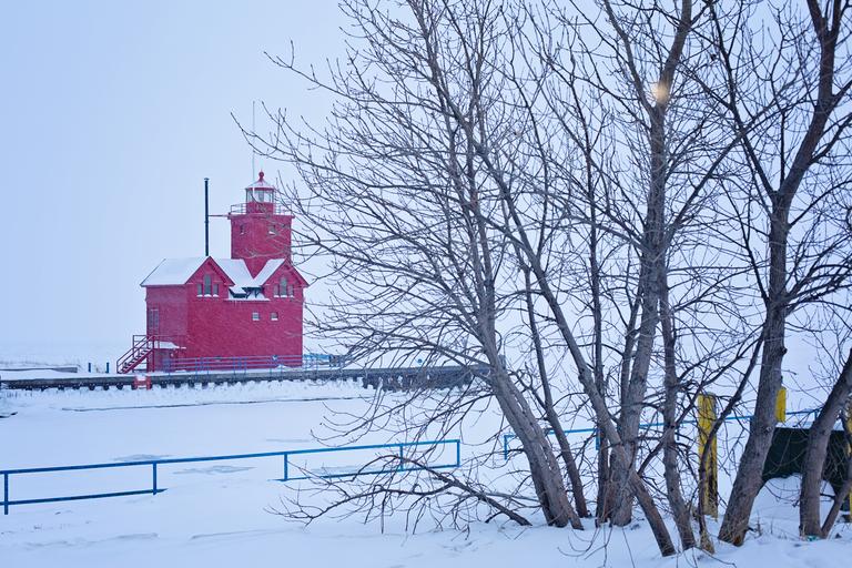 Keywords: lighthouse winter red snow ice landscape cold nautical michigan