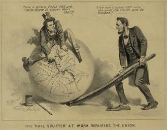 | Keywords: Lincoln and Johnsona.jpg en Cartoon print shows Vice President Andrew Johnson sitting atop a globe attempting to stitch together the map of the United States with needle and thread Abraham Lincoln stands right using a split rail to position the globe Johnson a former tailor warns Take it quietly Uncle Abe and I will draw it closwer than ever While Lincoln the former rail-splitter commends him A few more stitches Andy and the good old Union will be mended Unedited version of original LoC file downsized to meet upload parameters Revision a in stepwise tutorial original file has been rotated and cropped Original was hand-drawn and slightly nonparallel so bottom caption has been copied onto another file rotated separately and copied and pasted back This operation didn't quite achieve an even effect and was repeated later in the restoration work Library of Congress CALL NUMBER PC/US - 1865 B1675 no 3 A size P P Joseph E Baker 1865 See PD-old Lincoln-Johnson tutorial |