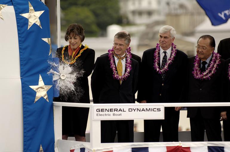 Keywords: Linda Lingle navy 2.jpg on original page 060617-N-3642E-004 Groton Conn Jun 17 2006 - Hawaii Governor the Honorable Linda Lingle smashes a bottle of champagne against the sail of the Virginia-class nuclear attack submarine Pre-Commissioning Unit PCU Hawaii SSN 776 during the ship's christening ceremony General Dynamics Electric Boat President Mr John Casey Sen Christopher Dodd and Sen Daniel Inouye watch as the ship receives the governor's blessing Hawaii is the third Virginia-class submarine to be christened and the 1st major U S Navy combatant vessel class designed with the post-Cold War security environment in mind and embodies the war fighting and operational capabilities required to dominate the littorals while maintaining undersea dominance in the open ocean U S Navy photo by Photographer's Mate 1st Class Shawn P Eklund RELEASED PD-USGov-Military-Navy Linda Lingle Chris Dodd Daniel Inouye General Dynamics Electric Boat USS Hawaii SSN-776 Ship christenings Champagne drink |