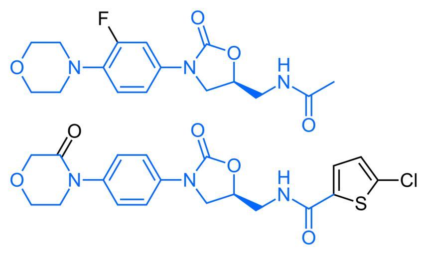 Keywords: Linezolid–rivaroxaban comparison.svg Skeletal formulae of the antibiotic linezolid top and the anticoagulant rivaroxaban bottom highlighting their similar oxazolidinone core in blue Created using http //www acdlabs com/download/chemsk html ACD/ChemSketch 10 0 and Inkscape Own work The structural similarity between the drugs is discussed in cite web http //www emea europa eu/humandocs/PDFs/EPAR/xarelto/H-944-en6 pdf CHP Assessment Report for Xarelto EMEA/543519/2008 European Medicines Agency 2008 2009-06-11 2009-06-11 Fvasconcellos Linezolid Rivaroxaban