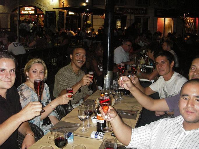 | Keywords: Linguists say 'Bonjour' to France - Military linguists visit France for language immersion DVIDS136564.jpg en 1st Sgt Robert Leonard of Lafayette La 3rd from left along with Sgt Carlos Torres of Kenner La 1st on right share dinner and wine with classmates from around the world at a restaurant in Bordeaux France Leonard and Torres linguists from the Louisiana Army National Guard's 415th Military Intelligence Battalion in Carville La were sent to France for two weeks this summer to enhance their language skills 2008-08-16 Sgt Tresa L Allemang https //www dvidshub net/image/136564 136564 2008-12-16 12 39 BORDEAUX FR PD-USGov Louisiana Army National Guard Images from DoD uploaded by Fæ |