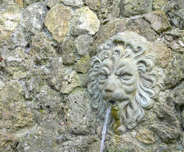 Keywords: lion head fountain source rock stone water old photo close gargoyle lion antique masonry spit