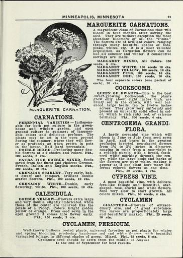 | Keywords: Lippincott seeds (15750727664).jpg  MINNEAPOLIS MINNESOTA <br> 21 <br> MMrtGUERITE CARM riON <br> CARNATIONS <br> PERENNIAL VABIET1E8  Indispens- <br> able for both pot culture In the green- <br> house and window garden and open <br> ground culture In summer; of Innumer- <br> able colors and delicious perfume The <br> plants may be set in the open ground <br> during the summer where they will flow- <br> er as profusely as when grown in pots <br> in the house Half hard perennials <br> DOUBLE MIXED  Producing many dou- <br> ble flowers of all shades and colors Pkt <br> 100 seeds 8 cts <br> EXTRA FINE DOUBLE MIXED  Seeds <br> saved from the finest and choicest German <br> French Italian and English stocks Pkt <br> 100 seeds 10 cts <br> GBENADIN SCARLET  Very early hab- <br> it dwarf and compact brilliant double <br> scarlet flowers Pkt 100 seeds 10 cts <br> GRENADIN WHITE  Double early <br> flowering white Pkt 100 seeds 10 cts <br> CALENDULA <br> MARGUERITE CARNATIONS <br> A magnificent class of Carnations that will <br> bloom in four months after sowing the <br> seed They are without exception the most <br> abundant bloomers of all the Pinks <br> The flowers are of brilliant colors ranging <br> through many beautiful shades of reds <br> pinks whites etc It Is a most valuable <br> acquisition as Carnation flowers can be <br> had all summer and winter if consecutive <br> sowings are made <br> MARGARET MIXED All Colors 150 <br> seeds 5 cts <br> MARGARET WHITE 100 seeds 10 cts <br> MARGARET YELLOW 100 seeds 10 cts <br> MARGARET PINK 100 seeds 10 cts <br> MARGARET RED 100 seeds 10 cts <br> The four separate colors one packet of <br> each 30 cts <br> COCKSCOMB <br> QUEEN OF DWARFS  This is the best <br> dwarf-growing Cockscomb; the plants <br> grow only about eight inches high are <br> firmly set in the crown with well bal- <br> anced large heads ten to twelve Inches <br> across They grow very uniformly and <br> present an unusually solid effect in col- <br> or which is rich ruby red of extreme <br> brilliancy Pkt 200 seeds 4 cts <br> CENTROSEMA GRANDI- <br> FLORA <br> A hardy perennial vine which will <br> bloom in June or July from seed sown <br> in April and bears in the greatest <br> profusion Inverted pea-shaped flowers <br> from 1 to 21 inches in diameter <br> ranging in color from a rose-violet to <br> a reddish purple with a broad feath- <br> ered white marking through the cen- <br> ter while the large buds and backs of <br> the flowers are pure white making It <br> appear as if one plant bore many dif- <br> ferent colored flowers at one time <br> Pkt 50 Needs 4 cts <br> CYPRESS VINE <br> A most beautiful vine with delicate <br> fern-like foliage and beautiful star- <br> shaped rose scarlet and white flowers <br> Seed very slow to start growth All <br> colors mixed Pkt 50 seeds 4 cts <br> DOUBL-E YELLOW  Flowers extra large <br> and very double slightly imbricated while <br> those of the center are incurved like the <br> petals of a Peony Colors bright golden <br> yellow or orange From seed sown in the <br> open ground it comes into flower early <br> Pkt 150 seeds 3 cts <br> CYCLAMEN <br> GIGANTEUM  Flowers of extraor- <br> dinary size and of great substance <br> The leaves are proportionately large <br> and beautifully marked Pkt 25 seeds <br> 10 cts <br> CYCLAMEN PERSICUM <br> Well-known bulbous rooted plants universal favorites as pot plants for winter <br> and spring blooming nrodiicing handsome red find white flowprs vrifh beautiful <br> variegated foliage in different shades of green Mixed Pkt 25 seeds 6 cts <br> Cyclamen seed should be sown from the middle of Aug ust <br> to the end of September for best results 42162034 132824 65968 Page 21 Text http //www biodiversitylibrary org/page/42162034 1915 Henry G Gilbert Nursery and Seed Trade Catalog Collection ; Miss C H Lippincott Firm NameFound Calendula NameConfirmed Calendula EOLID 59414 NameBankID 25725 NameFound Centrosema grandi NameFound Cyclamen giganteum Biodiversity Heritage Library Lippincott seeds 1915 Garden Stories Catalogs Flowers Fruit Nurseries Horticulture Seeds Vegetables U S Department of Agriculture National Agricultural Library bhl page 42162034 dc identifier http //biodiversitylibrary org/page/42162034 bhlGardenStories BHLinbloom nurseries horticulture u s department of agriculture national agricultural library bhlgardenstories bhlinbloom Information field Flickr posted date ISOdate 2015-01-26 Check categories 2015 August 25 CC-BY-2 0 BioDivLibrary https //flickr com/photos/61021753 N02/15750727664 2015-08-25 05 53 58 cc-by-2 0 PD-old-70-1923 Lippincott seeds Photos uploaded from Flickr by FĂŚ using a script |