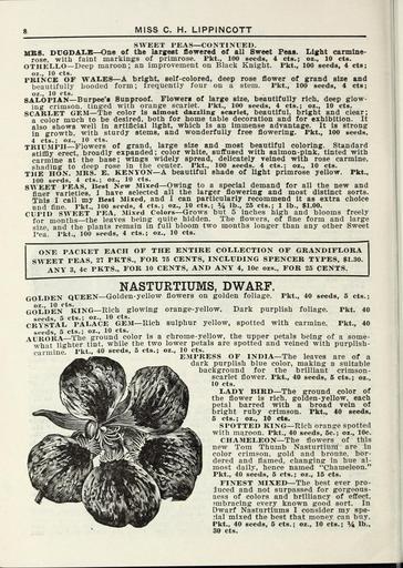 Keywords: Lippincott seeds (15753157203).jpg MISS C H LIPPINCOTT <br> SWEET TEAS ” CONTINUED <br> MBS DUGDALiB ” One of the largest flowered of all Sweet Peas Light carmine- <br> rose with faint markings of primrose Pkt 100 seeds 4 cts ; oz 10 cts <br> OTHELLO ” Deep maroon; an improvement on Black Knight Pkt 100 seeds 4 cts; <br> oz 10 cts <br> PBINCB OF WALES ” A bright self-colored deep rose flower of grand size and <br> beautifully hooded form; frequently four on a stem Pkt 100 seeds 4 cts; <br> oz 10 cts <br> SALOPIAN ” Burpee's Sunproof Flowers of large size beautifully rich deep glow- <br> ing crimson tinged with orange scarlet Pkt 100 seeds 4 cts ; oz 10 cts <br> SCARLET GEM ” The color is almost dazzlinsr scarlet beautiful bright and clear; <br> a color much to be desired both for home table decoration and for exhibition It <br> also shows well in artificial light which is an immense advantage It is strong <br> in growth with sturdy stems and wonderfully free flowering Pkt 100 seeds <br> 4 cts ; oz 10 cts <br> TKIUMPJI ” Flowers of grand large size and most beautiful coloring Standard <br> stiffly erect broadly expanded; color white suffused with salmon-pink tinted with <br> carmine at the base; wings widely spread delicately veined with rose carmine <br> shading to deep rose in the center Pkt 100 seeds 4 cts ; oz 10 cts <br> THE HON J rRS E KENYON ” A beautiful shade of light primrose yellow Pkt <br> 100 seeds 4 cts ; oz 10 cts <br> SWEET I'EAS Best New Mixed ” Owing to a special demand for all the new and <br> finer varieties I have selected all the larger flowering and most distinct sorts <br> This I call my Best Mixed and I can particularly recommend it as extra choice <br> and fine Pkt 100 seeds 4 cts ; oz 10 cts ; lb 25 cts ; 1 lb 1 00 <br> CUPID SWEET PEA Mixed Colors Jrows but 5 inches high and blooms freely <br> for months ” the leaves being quite hidden The flowers of fine form and large <br> size and the plants remain in full bloom two months longer than any other Sweet <br> I'ea I'kt 100 seeds 4 cts ; oz 10 cts <br> ONE PACKET EACH OF THE ENTIRE COLLECTION OF GRANDIFLORA <br> SWEET PEAS 27 PKTS FOR 75 CENTS INCLUDING SPENCER TYPES 1 30 <br> ANY 3 4c PKTS FOR 10 CENTS AND ANY 4 10c ozs FOR 25 CENTS <br> carmine <br> NASTURTIUMS DWARF <br> GOLDEN QUEEN ” Golden-yellow flowers on golden foliage Pkt 40 seeds 5 cts ; <br> GOLDEN KING ” Rich glowing orange-yellow Dark purplish foliage Pkt 40 <br> tweeds 5 cts ; oz 10 cts <br> CRYSTAL PALACE GEM ” Rich sulphur yellow spotted with carmine Pkt 40 <br> seeds 5 cts ; oz 10 cts <br> AURORA The ground color is a chrome-yellow the upper petals being of a some- <br> what lighter tint while the two lower petals are spotted and veined with purplish- <br> Pkt 40 seeds 5 cts ; oz 10 cts <br> EMPRESS OF INDIA ” The leaves are of a <br> dark purplish blue color making a suitable <br> background for the brilliant crimson- <br> scarlet flower Pkt 40 seeds 5 cts ; oz <br> 10 cts <br> LADY BIRD ” The ground color of <br> the flower Is rich golden-yellow each <br> petal barred with a broad vein of <br> bright ruby crimson Pkt 40 seeds <br> 5 cts ; oz 10 cts <br> SPOTTED KING ” Rich orange spotted <br> with maroon Pkt 40 seeds 6c ; oz 10c <br> CHA3IELEON ” The flowers of this <br> new Tom Thumb Nasturtium are in <br> color crimson gold and bronze bor- <br> dered and flamed changing in hue al- <br> most daily hence named Chameleon <br> Pkt 40 seeds 6 cts ; oz 16 cts <br> FINEST MIXED ” The best ever pro- <br> iuced and not surpassed for gorgeous- <br> Qess of colors and brilliancy of effect <br> embracing every known good sort In <br> Dwarf Nasturtiums I consider my spe- <br> cial mixed the best that money can buy <br> Pkt 40 seeds 5 cts ; oz 10 cts ; V lb <br> 30 cts 42162047 132824 65968 Page 8 Text http //www biodiversitylibrary org/page/42162047 1915 Henry G Gilbert Nursery and Seed Trade Catalog Collection ; Miss C H Lippincott Firm Biodiversity Heritage Library Lippincott seeds 1915 Garden Stories Catalogs Flowers Fruit Nurseries Horticulture Seeds Vegetables U S Department of Agriculture National Agricultural Library bhl page 42162047 dc identifier http //biodiversitylibrary org/page/42162047 bhlGardenStories BHLinbloom nurseries horticulture u s department of agriculture national agricultural library bhlgardenstories bhlinbloom Information field Flickr posted date ISOdate 2015-01-26 Check categories 2015 August 25 CC-BY-2 0 BioDivLibrary https //flickr com/photos/61021753 N02/15753157203 2015-08-25 05 55 50 cc-by-2 0 PD-old-70-1923 Lippincott seeds Photos uploaded from Flickr by FĂŚ using a script