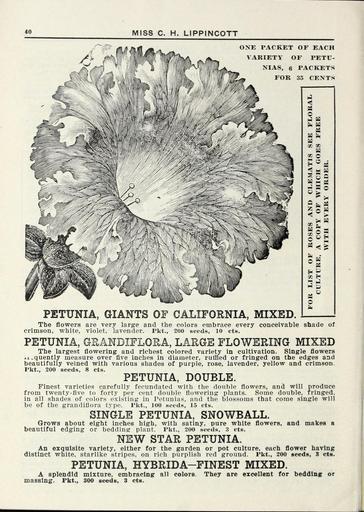 | Keywords: Lippincott seeds (15753240513).jpg 40 <br> MISS C H LIPPINCOTT <br> 4 <br> M <br> ONE PACKET OF EACH <br> \ ARIETY OF PETU- <br> PACKETS <br> 35 CENTS <br> hi <br> <br> » <br> o <br> <br> u <br> H <br> « <br> H <br> t <br> H <br> OD <br> O <br> H <br> cc <br> O <br> H <br> O <br> oi <br> <br> S <br> » <br> – – <br> Q <br> bi <br> tf <br> » <br> o <br> u <br> <br> <br> a <br> b <br> A <br> 5 <br> O <br> H <br> <br> H 1 <br> o <br> H <br> « <br> 3 <br> <br> Em <br> <br> M <br> di <br> H <br> a <br> Vi <br> H <br> nJ <br> <br> U <br> » <br> u <br> p <br> ; <br> PETUNIA GIANTS OF CALIFORNIA MIXED <br> The flowers are very large and the colors embrace every conceivable shade of <br> crimson white violet lavender Pkt 200 seeds 10 cts <br> PETUNIA GRANDIFLORA LARGE FLOWERING MIXED <br> The largest flowering and richest colored variety in cultivation Single flowers <br> i-i quently measure over five inches in diameter ruflled or fringed on the edges and <br> beautifully veined with various shades of purple rose lavender yellow and crimson <br> Pkt 200 seeds 8 cts <br> PETUNIA DOUBLE <br> Finest varieties carefully fecundated with the double flowers and will produce <br> from twenty-five to forty per cent double flowering plants Some double fringed <br> in all shades of colors existing in Petunias and the blossoms that come single will <br> be of the grandiflora type Pkt JOO seeds 15 cts <br> SINGLE PETUNIA SNOWBALL <br> Grows about eight inches high with satiny pure white flowers and makes a <br> beautiful edging or bedding plant Pkt 200 seeds 3 cts <br> NEW STAR PETUNIA <br> An exquisite variety either for the garden or pot culture each flower having <br> distinct white starlike stripes on rich purplish rod ground Pkt 200 seeds S cts <br> PETUNIA HYBRIDA-FINEST MIXED <br> A splendid mixture embracing all colors They are excellent for bedding or <br> massing Pkt 300 seeds 3 cts 42162010 132824 65968 Page 40 Text http //www biodiversitylibrary org/page/42162010 1915 Henry G Gilbert Nursery and Seed Trade Catalog Collection ; Miss C H Lippincott Firm NameFound Petunia NameConfirmed Petunia Juss EOLID 60149 Biodiversity Heritage Library Lippincott seeds 1915 Garden Stories Catalogs Flowers Fruit Nurseries Horticulture Seeds Vegetables U S Department of Agriculture National Agricultural Library bhl page 42162010 dc identifier http //biodiversitylibrary org/page/42162010 bhlGardenStories BHLinbloom nurseries horticulture u s department of agriculture national agricultural library bhlgardenstories bhlinbloom Information field Flickr posted date ISOdate 2015-01-26 Check categories 2015 August 25 CC-BY-2 0 BioDivLibrary https //flickr com/photos/61021753 N02/15753240513 2015-08-25 05 50 41 cc-by-2 0 PD-old-70-1923 Lippincott seeds Photos uploaded from Flickr by Fæ using a script |