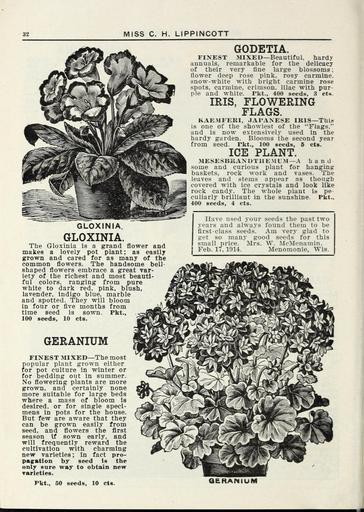 | Keywords: Lippincott seeds (16185808120).jpg 32 <br> MISS C H LIPPINCOTT <br> GODETIA <br> FINEST MIXED ” Beautiful hardv <br> annuals remarkable for the delicacy <br> of their very tine large blossoms ; <br> flower deep rose pink rosy carmine <br> snow-white with bright carmine rose <br> spots carmine crimson lilac with pur- <br> ple and white Pkt 400 seeds 3 cts <br> IRIS FLOWERING <br> FLAGS <br> KAEMFERI JAPANESE IRIS ” This <br> Ls one of the showiest of the Flags <br> and is now extensively used in the <br> hardy garden Blooms the second year <br> from seed rkt 100 seeds 5 cts <br> ICE PLANT <br> MESESBKANUTllE ML M ” A hand <br> some and curious plant for hanging <br> baskets rock work and vases The <br> leaves and stems appear as though <br> covered with ice crystals and look like <br> rock candy The whole plant is pe- <br> culiarly brilliant in the sunshine Pkt <br> 400 seeds 4 cts <br> GLOXINIA <br> GLOXINIA <br> The Gloxinia is a grand flower and <br> makes a lovely pot plant; as easily <br> grown and cared for as many of the <br> common flowers The handsome bell- <br> shaped flowers embrace a great var- <br> iety of the richest and most beauti- <br> ful colors ranging from pure <br> white to dark red pink blush <br> lavender indigo blue marble <br> and spotted They will bloom <br> in four or five months from <br> time seed is sown Pkt <br> 100 seeds 10 cts <br> GERANIUM <br> FINEST MIXED ” The most <br> popular plant grown either <br> for pot culture in winter or <br> for bedding out in summer <br> No flowering plants are more <br> grown and certainly none <br> more suitable for large beds <br> where a mass of bloom is <br> desired or for single speci- <br> mens in pots for the house <br> But few are aware that they <br> can be grown easily from <br> seed and flowers the first <br> season If sown early and <br> will frequently reward the <br> cultivation with charming <br> new varieties ; in fact pro- <br> pac »tlon by seed is the <br> only sore way to obtain new <br> Tarieties <br> Pkt 60 seeds 10 cts <br> Have used your seeds the past two <br> years and always found them to be <br> first-class seeds Am very glad to <br> get so many good seeds for this <br> small price Mrs W McMenamin <br> Feb IT 1914 Menomonie Wis <br> GERANIUM 42162023 132824 65968 Page 32 Text http //www biodiversitylibrary org/page/42162023 1915 Henry G Gilbert Nursery and Seed Trade Catalog Collection ; Miss C H Lippincott Firm NameFound Gloxinia NameConfirmed Gloxinia L'Her EOLID 72184 NameFound Godetia NameConfirmed Godetia EOLID 5466836 NameBankID 3471363 Biodiversity Heritage Library Lippincott seeds 1915 Garden Stories Catalogs Flowers Fruit Nurseries Horticulture Seeds Vegetables U S Department of Agriculture National Agricultural Library bhl page 42162023 dc identifier http //biodiversitylibrary org/page/42162023 bhlGardenStories BHLinbloom nurseries horticulture u s department of agriculture national agricultural library bhlgardenstories bhlinbloom Information field Flickr posted date ISOdate 2015-01-26 Check categories 2015 August 25 CC-BY-2 0 BioDivLibrary https //flickr com/photos/61021753 N02/16185808120 2015-08-25 05 54 46 cc-by-2 0 PD-old-70-1923 Lippincott seeds Photos uploaded from Flickr by Fæ using a script |