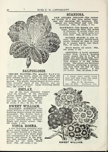 | Keywords: Lippincott seeds (16187018509).jpg MISS C H LIPPINCOTT <br> SALPIGLOSIS <br> SCABIOSA <br> NEW OOIiDBN YELLOW ” The tiowerg <br> are double of a fine pure yellow color <br> and are charming for bouquets The <br> plants are semi- dwarf and very free <br> blooming Pkt 50 seeds 3 cts <br> SNOWBALL ” The flowerg are very <br> large measuring fully two inches <br> in diameter of purest white and <br> very double It comes quite true <br> from seed Pkt 50 seeds 3 cts <br> DOUBLE BLACK ” A new va- <br> riety with elegant double-black <br> purple flowers so deep in color <br> as to appear nearly coal black <br> Pkt 50 seeds 3 cts <br> Mixed double all colors Pkt <br> 100 seeds 3 cts <br> JAPONICA ” A hardy perennial <br> variety from Japan forming <br> bushy plants 2V to 8 feet in <br> height and bearing on long wiry <br> stems beautiful artistic lavender- <br> blue flowers 2 to 2 inches <br> across The plants are extremely <br> floriferous producing a continu- <br> ous crop from the end of June <br> until late in autumn A fine <br> cut flower Pkt 50 seeds 5 cts <br> VELVET FLOWER ” The graceful flowers <br> borne on long stems range in color from the <br> most delicate shades of light blue and straw color <br> to the deepest purple and the richest brown and <br> maroon The quaint funnel-shaped flowers some- <br> what resemble those of the Petunia and are <br> borne in great profusion <br> Pkt 300 seeds 4 cts <br> Large flowering mixed <br> I plant your seeds every <br> year and find them the most <br> reliable seeds I can buy <br> Mrs F W Hawkins <br> Apr 10 1914 Portland Ore <br> SMILAX <br> One of the most desirable window <br> vines on account of its charming <br> glossy green elegant and graceful <br> foliage; also fine for hanging <br> baskets It will grow several <br> feet high the first season Pkt <br> 50 seeds 5 cts ; 4 oz 18 cts <br> SWEET WILLIAM <br> DIANTHUS BARBATUS ” The <br> Sweet William is one of the finest <br> fiowering plants among the hardy <br> perennials The fiowers have a <br> wide range of bright colors and <br> varied markings including the <br> finest auricula-eyed varieties <br> Single and double mixed Pkt <br> 200 seeds 4 cts <br> VINCA ROSEA <br> A free flowering perennial with <br> f lossy green foliage and beautl- <br> ul circular flowers of a fine rose <br> color If sown early under glass <br> and transplanted in a warm sit- <br> uation will bloom in the sum- <br> mer and autumn and may be <br> potted for the bou «» bef«r« <br> frost Pkt 100 seeds 3 cts <br> 8WEET WILLIAM 42162014 132824 65968 Page 44 Text http //www biodiversitylibrary org/page/42162014 1915 Henry G Gilbert Nursery and Seed Trade Catalog Collection ; Miss C H Lippincott Firm NameFound Dianthus barbatus NameConfirmed Dianthus barbatus EOLID 587229 NameBankID 2646564 NameFound Petunia NameConfirmed Petunia Juss EOLID 60149 NameFound Scabiosa NameConfirmed Scabiosa 'Simon Greaves' EOLID 49101 NameFound Smilax NameConfirmed Smilax Jorge08 EOLID 3396175 NameFound Vinca rosea NameConfirmed Vinca rosea EOLID 581125 NameBankID 2775716 Biodiversity Heritage Library Lippincott seeds 1915 Garden Stories Catalogs Flowers Fruit Nurseries Horticulture Seeds Vegetables U S Department of Agriculture National Agricultural Library bhl page 42162014 dc identifier http //biodiversitylibrary org/page/42162014 bhlGardenStories BHLinbloom nurseries horticulture u s department of agriculture national agricultural library bhlgardenstories bhlinbloom Information field Flickr posted date ISOdate 2015-01-26 Check categories 2015 August 25 CC-BY-2 0 BioDivLibrary https //flickr com/photos/61021753 N02/16187018509 2015-08-25 05 51 01 cc-by-2 0 PD-old-70-1923 Lippincott seeds Photos uploaded from Flickr by Fæ using a script |