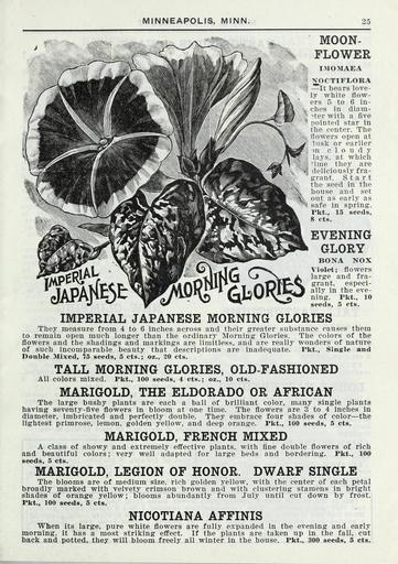 Keywords: Lippincott seeds (16187190829).jpg s are inadequate Pkt Single and <br> Double Mixed 75 seeds 5 cts ; oz 20 cts <br> TALL MORNING GLORIES OLD-FASHIONED <br> All colors mixed Pkt 100 seeds 4 cts ; oz 10 cts <br> MARIGOLD THE ELDORADO OR AFRICAN <br> The large bushy plants are each a ball of brilliant color many single plants <br> having seventy-five flowers in bloom at one time The flowers are 3 to 4 inches In <br> diameter imbricated and perfectly double They embrace four shades of color ” the <br> lightest primrose lemon golden yellow and deep orange Pkt 100 seeds 5 cts <br> MARIGOLD FRENCH MIXED <br> A class of showy and extremely effective plants with fine double flowers of rich <br> and beautiful colors; very well adapted for large beds and bordering Pkt 100 <br> ' marigold legion of honor dwarf single <br> The blooms are of medium size rich golden yellow with the center of each petal <br> broadly marked with velvety crimson brown and with clustering stamens in bright <br> shades of orange yellow; blooms abundantly from July until cut down by frost <br> Pkt 100 seeds 5 cts <br> NICOTIANA AFFINIS <br> When its large pure white flowers are fully expanded in the evening and early <br> morning it has a most striking effect If the plants are taken up in the fall cut <br> back and potted they will bloom freely all winter in the house Pkt 300 seeds 5 cts 42205433 132981 65968 Page 25 Text http //www biodiversitylibrary org/page/42205433 1915 Henry G Gilbert Nursery and Seed Trade Catalog Collection ; Miss C H Lippincott Firm NameFound Bona nox NameFound Nicotiana affinis NameConfirmed Nicotiana affinis T Moore EOLID 486699 NameBankID 618477 Biodiversity Heritage Library Lippincott seeds 1916 Garden Stories Catalogs Flowers Fruit Nurseries Horticulture Seeds Vegetables U S Department of Agriculture National Agricultural Library bhl page 42205433 dc identifier http //biodiversitylibrary org/page/42205433 bhlGardenStories BHLinbloom nurseries horticulture u s department of agriculture national agricultural library bhlgardenstories bhlinbloom Information field Flickr posted date ISOdate 2015-01-26 Check categories 2015 August 25 CC-BY-2 0 BioDivLibrary https //flickr com/photos/61021753 N02/16187190829 2015-08-25 05 51 28 cc-by-2 0 PD-old-70-1923 Lippincott seeds Photos uploaded from Flickr by Fæ using a script |