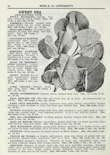 | Keywords: Lippincott seeds (16347459816).jpg 36 <br> MISS C H LIPPINCOTT <br> SWEET PEA <br> GRANDIFLORA TYPE <br> APPLE BLOSSOMS Bright ro' y <br> pink standards blush wings Pkt 100 <br> seeds 5 cts ; oz 10 cts <br> AMERICA-- Heavily striped with <br> bright blood red on white ground <br> Pkt 100 seeds 5 cts ; oz 10 cts <br> BLANCHE FERRY Beautiful com- <br> bination of pink and white very fra- <br> grant Pkt 100 seeds 5 <br> cts ; oz 10 cts <br> COUNTESS or RADNOR <br> Standard light mauve <br> fading into a soft laven- <br> der ; wings a lighter <br> shade Pkt 100 seeds 5 <br> cts ; oz 10 cts <br> DOROTHY ECKFORD <br> The finest pure white <br> yet produced bearing 3 <br> blossoms on a stem Pkt <br> 100 seeds 5 c ; oz 10 cts <br> DUKE OF WESTMIN- <br> STER Standard clear <br> purple Wings purple with <br> tint of violet Larg e size <br> hooded form Pkt 100 <br> seeds 5 cts oz 10 cts <br> JANET SCOTT R i c h <br> pink considerably deeper <br> than Katherine Tracy <br> Pkt 100 seeds 5 cts ; oz <br> 10 cts <br> LORD NELSON Deeper richer <br> than Navy Blue Pkt 100 seeds 5 <br> cts ; oz 10 cts <br> JESSIE CUTHBERTSON Creamy white striped dark rose <br> oz 10 cts <br> KING EDWARD VII The best red Sweet Pea up to date An improvement on <br> Firefly Pkt 100 seeds 5 cts ; oz 10 cts <br> LADY NINA BALFOUR Large expanded form with flowers beautifully hooded <br> Coloring a pale lavender or lilac free from any reddish tint Pkt 100 seeds 5 cts ; <br> oz 10 cts <br> LOVELY Standard and wings both deep pink <br> Large size hooded form Very vigorous grower <br> 100 seeds 5 cts ; oz 10 cts <br> MRS JOS CHAMBERLAIN A white ground heavily striped with rose Pkt 100 <br> seeds 5 cts ; oz 10 cts <br> iVIAID OF HONOR Flowers beautifully shaded light blue on white ground edged <br> with narrow deep rich violet Pkt 100 seeds 5 cts ; oz 10 cts <br> MISS WILLMOTT Richest orange-pink flowers measure 1 1-5 inches across and <br> are borne on long stiff stems 12 to 16 inches long Pkt 100 seeds 5 cts ; oz 10 cts <br> OTHELLO Deep maroon; an improvement on Black Knight Pkt 100 seeds 5 cts ; <br> oz 10 cts <br> PRINCE OF WALES A bright self-colored deep rose flower of grand size and <br> beautifully hooded form; frequently four on a stem Pkt 100 seeds 5c; oz lOc <br> SALOPIAN Burpee's Sunproof Flowers of large size beautifully rich deep <br> growing crimson tinged with orange scarlet Pkt 100 seeds 5 cts ; oz 10 cts <br> TRIUMPH Flowers of grand large size and most beautiful coloring Standard <br> stiffly erect broadly expanded; color white suffused with salmon-pink tinted with <br> carmine at the base; wings widely spread delicately veined with <br> shading to deep rose in the center Pkt 100 seeds 5 cts ; oz 10 cts <br> shading to very light pink at edges <br> It is a very effective variety Pkt <br> rose carmine 42205444 132981 65968 Page 36 Text http //www biodiversitylibrary org/page/42205444 1915 Henry G Gilbert Nursery and Seed Trade Catalog Collection ; Miss C H Lippincott Firm NameFound Nina NameConfirmed Nina NameBankID 3002505 Biodiversity Heritage Library Lippincott seeds 1916 Garden Stories Catalogs Flowers Fruit Nurseries Horticulture Seeds Vegetables U S Department of Agriculture National Agricultural Library bhl page 42205444 dc identifier http //biodiversitylibrary org/page/42205444 bhlGardenStories BHLinbloom nurseries horticulture u s department of agriculture national agricultural library bhlgardenstories bhlinbloom Information field Flickr posted date ISOdate 2015-01-26 Check categories 2015 August 25 CC-BY-2 0 BioDivLibrary https //flickr com/photos/61021753 N02/16347459816 2015-08-25 05 56 46 cc-by-2 0 PD-old-70-1923 Lippincott seeds Photos uploaded from Flickr by FĂŚ using a script |