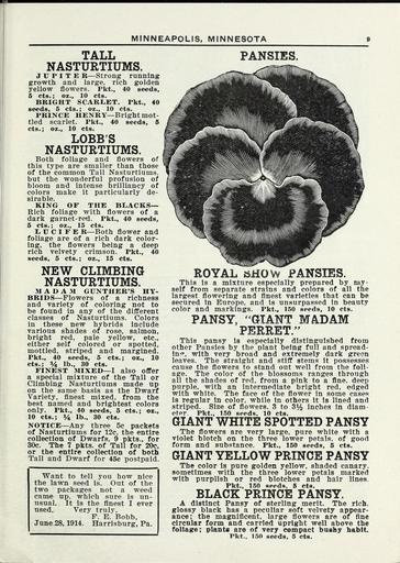 Keywords: Lippincott seeds (16371424751).jpg MINNEAPOLIS MINNESOTA <br> TALL <br> NASTURTIUMS <br> J U P 1 T E B Strong running <br> growth and large rich golden <br> yellow flowers Pkt 40 seeds <br> 6 cts ; oz 10 cts <br> BRIGHT SCARLET Pkt 40 <br> seeds 5 cts ; oz 10 cts <br> PRINCE HENRY Bright mot- <br> tled scarlet Pkt 40 seeds 6 <br> cts ; oz 10 cts <br> LOBB'S <br> NASTURTIUMS <br> Both foliage and flowers of <br> this type are smaller than those <br> of the common Tall Nasturtiums <br> but the wonderful profusion of <br> bloom and intense brilliancy of <br> colors make it particularly de- <br> sirable <br> KING OF THE BLACKS <br> Rich foliage with flowers of a <br> dark garnet- rexi Pkt 40 seeds <br> 5 cts ; oz 15 cts <br> li U C I F E R Both flower and <br> foliage are of a rich dark color- <br> ing the flowers being a deep <br> rich velvety crimson Pkt 40 <br> seeds 5 cts ; oz 15 cts <br> NEW CLIMBING <br> NASTURTIUMS <br> M A D A M GUNTHER'S HY- <br> BRIDS Flowers of a richness <br> and variety of coloring not to <br> be found in any of the different <br> classes of Nasturtiums Colors <br> in these new hybrids include <br> various shades of rose salmon <br> bright red pale yellow etc <br> either self colored or spotted <br> mottled striped and margined <br> Pkt 40 seeds 5 cts ; oz 10 <br> cts ; lb 30 cts <br> FINEST MIXED I also offer <br> a special mixture of the Tall or <br> Climbing Nasturtiums made up <br> on the same basis as the Dwarf <br> Variety finest mixed from the <br> best named and brightest colors <br> only Pkt 40 seeds 5 cts ; oz <br> 10 cts ; 4 lb 30 cts <br> NOTICE Any three 5c packets <br> of Nasturtiums for 12c the entire <br> collection of Dwarfs 9 pkts for <br> 30c The 7 pkts of Tall for 20c <br> or the entire collection of both <br> Tall and Dwarf for 45c postpaid <br> PANSIES <br> Want to tell you how nice <br> the lawn seed is Out of the <br> two packages not a weed <br> came up which sure is un- <br> usual It Is the finest I ever <br> used Very truly <br> F E Bobb <br> June 28 1914 Harrisburg Pa <br> ROYAL bHOW PANSIES <br> This is a mixture especially prepared by my- <br> self from separate strains and colors of all the <br> largest flowering and flnest varieties that can be <br> secured in Europe and is unsurpassed in beauty <br> color and markings Pkt 150 seeds 10 cts <br> PANSY GIANT MADAM <br> PERRET <br> This pansy Is especially distinguished from <br> other Pansles by the plant being full and spread- <br> in ' with very broad and extremely dark green <br> leaves The straight and stiff stems it possesses <br> cause the flowers to stand out well from the foli- <br> age The color of the blossoms ranges through <br> all the shades of red from a pink to a fine deep <br> purple with an intermediate bright red edged <br> with white The face of the flower In some cases <br> Is regular in color while in others it is lined and <br> striped Size of flowers 3 to 3 Inches In diam- <br> eter Pkt 150 seeds 10 cts <br> GIANT WHITE SPOTTED PANSY <br> The flowers are very large pure white with a <br> violet blotch on the three lower petals of good <br> form and substance Pkt 150 seeds 6 cts <br> GIANT YELLOW PRINCE PANSY <br> The color is pure golden yellow shaded canary <br> sometimes with the three lower petals marked <br> with purplish or red blotches and hair lines <br> Pkt 150 seeds 5 cts <br> BLACK PRINCE PANSY <br> A distinct Pansy of sterling merit The rich <br> glossy black has a peculiar soft velvety appear- <br> ance; the magnificent large flowers are of fine <br> circular form and carried upright well above the <br> foliage; plants are of very compact bushy habit <br> Pkt 150 seeds 5 cts 42162046 132824 65968 Page 9 Text http //www biodiversitylibrary org/page/42162046 1915 Henry G Gilbert Nursery and Seed Trade Catalog Collection ; Miss C H Lippincott Firm Biodiversity Heritage Library Lippincott seeds 1915 Garden Stories Catalogs Flowers Fruit Nurseries Horticulture Seeds Vegetables U S Department of Agriculture National Agricultural Library bhl page 42162046 dc identifier http //biodiversitylibrary org/page/42162046 bhlGardenStories BHLinbloom nurseries horticulture u s department of agriculture national agricultural library bhlgardenstories bhlinbloom Information field Flickr posted date ISOdate 2015-01-26 Check categories 2015 August 25 CC-BY-2 0 BioDivLibrary https //flickr com/photos/61021753 N02/16371424751 2015-08-25 05 55 53 cc-by-2 0 PD-old-70-1923 Lippincott seeds Photos uploaded from Flickr by FĂŚ using a script |