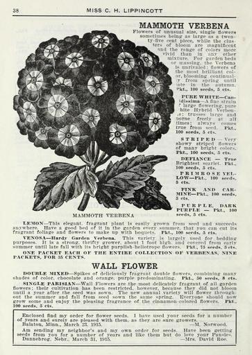 | Keywords: Lippincott seeds (16371704781).jpg 38 <br> MISS C H LIPPINCOTT <br> MAMMOTH VERBENA <br> Flowers of unusual size single flowers <br> sometimes being as large as a twen- <br> ty-five cent piece while the clus- <br> ters of bloom are magnificent <br> Tud the range of colors more <br> – id than in any other <br> mixture For garden beds <br> or massing the Verbena <br> is unrivaled flowers of <br> the most brilliant col- <br> or blooming continual- <br> y from spring until <br> ate in the autumn <br> Pkt 100 seeds 5 cts <br> PURE WHITE ” Can- <br> idissima ” A fine strain <br> large flowering pure <br> hite Hybrid Verben- <br> as tru-;ses large and <br> t orne freely at all <br> times always comes <br> true from seed Pkt <br> 100 seeds 5 ct <br> STRIPED ” Very <br> showy striped flower <br> of many bright colors <br> Pkt 100 seeds 5 cts <br> DEFIAXCE ” True <br> Brightest scarlet Pkt <br> 100 seeds 5 cts <br> PRIMROSE YEI - <br> L OW ” Pkt 100 seeds <br> 5 cts <br> PIXK AND CAR- <br> MINE ” Pkt 100 seeds <br> MAMMOTH VERBENA <br> PURPLE DARK <br> PLRPEE ” Pkt 100 <br> seeds 5 cts <br> LEMON ” This elegant fragrant plant is easily grown from seed and succeeds <br> anywhere Have a good bed of it in the garden every summer that you can cut its <br> fragrant foliage and flowers to make up with boquets Pkt 100 seeds 5 cts <br> VENOSA ” Hardy Garden Verbena This variety is largely used for bedding <br> purposes It is a strong thrifty grower about 1 foot high and covered from early <br> summer until late fall with its bright purplish-heliotrope flowers Pkt 75 seeds Sets <br> ONE PACKET EACH OF THE ENTIRE COLLECTION OF VERBENAS NINE <br> PACKETS FOR 35 CENTS <br> WALL FLOWER <br> DOUBLE MIXED ” Spikes of deliciously fragrant double flowers combining many <br> shades of color chocolate and orange purple predominating Pkt 50 seeds 8 cts <br> SINGLE PARISIAN ” Wall Flowers are the mo st delicately fragrant of all garden <br> flowers their cultivation has been restricted however because they did not bloom <br> until a year after the seed was sown The new annual variety will flower through- <br> out the summer and fall from seed sown the same spring Everyone should now <br> grow some and enjoy the pleasing fragrance of the cinnamon-colored flowers Pkt <br> 100 seeds 5 cts <br> Enclosed flnd my order for flower seeds I have used your seeds for a number <br> of years and surelv are pleased with them as they are sure growers <br> Balaton Minn March 23 1915 ” M Norwood <br> Am sending my neighbor's and my own order for seeds Have been getting <br> seeds from you for a number of years and like them but do love your Pansies <br> Dannebrog Nebr March 31 191 5 ”Mrs David Roe 42205446 132981 65968 Page 38 Text http //www biodiversitylibrary org/page/42205446 1915 Henry G Gilbert Nursery and Seed Trade Catalog Collection ; Miss C H Lippincott Firm NameFound Verbena NameConfirmed Verbena subser Pseudoracemosae N O'Leary EOLID 24001436 NameFound Verbena purple Biodiversity Heritage Library Lippincott seeds 1916 Garden Stories Catalogs Flowers Fruit Nurseries Horticulture Seeds Vegetables U S Department of Agriculture National Agricultural Library bhl page 42205446 dc identifier http //biodiversitylibrary org/page/42205446 bhlGardenStories BHLinbloom nurseries horticulture u s department of agriculture national agricultural library bhlgardenstories bhlinbloom Information field Flickr posted date ISOdate 2015-01-26 Check categories 2015 August 25 CC-BY-2 0 BioDivLibrary https //flickr com/photos/61021753 N02/16371704781 2015-08-25 05 51 18 cc-by-2 0 PD-old-70-1923 Lippincott seeds Photos uploaded from Flickr by Fæ using a script |