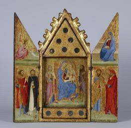 | Keywords: Lippo Vanni - Reliquary with Madonna and Child with Saints - Walters 37750.jpg Walters Art Museum artwork Creator Lippo Vanni This triptych or three-paneled altarpiece once contained relics in the circular holes of the central section Around the Madonna and Child in the places of honor are Saints Aurea and John the Baptist On the wings Gabriel announces the incarnation of Christ with the words written in Latin on his scroll which translate as the Holy Ghost shall come upon thee and the power of the Almighty shall overshadow thee from the mass sung on the Feast of the Annunciation The unidentified coats of arms are probably those of the donors The delicacy of this work reveals Vanni's debt to Simone Martini For more information on this reliquary please see Zeri catalogue number 26 pp 44-46 between 1350 1359 Medieval tempera tooled gold wood paper and relics Open cm 49 37 45 4 6 19 ; Center panel painted surface cm 22 38 19 84 ; Left wing cm 47 47 11 11 ; Right wing cm 47 78 11 43 accession number 37 750 12489 Don Marcello Massarenti Collection Rome date of acquisition unknown by purchase 1900 catalogue supplement no 49 as School of Fra Angelico Henry Walters city Baltimore Walters Art Museum Henry Walters Acquired by Henry Walters with the Massarenti Collection 1902 Transcription On central panel below left saint SANCTA AURA; Translation On central panel below left saint Saint Aurea; Transcription On central panel below right saint SANCTUS IOHNES BATTIST; Translation On central panel below right saint Saint John the Baptist; Transcription On left wing under left saint in black paint MAR ; Transcription On left wing under right saint in black paint S DOMINI; SANCTUS DOMINICUS; Translation On left wing under right saint in black paint Saint Dominic; Transcription On left wing in upper register on scroll SPIRITUS SANCTUS ET VENIET IN TE ET VIRTUS ALTISSIMI OBUMBRABIT TIBI; Translation On left wing in upper register on scroll the Holy Ghost shall come upon thee and the power of the Almighty shall overshadow thee Reliquaries and Ritual Medieval Objects of Devotion The Walters Art Gallery Baltimore 1984-1985 Treasures of Heaven The Cleveland Museum of Art Cleveland; The Walters Art Museum Baltimore; The British Museum London 2010-2011 The International Style The Arts in Europe Around 1400 The Walters Art Gallery Baltimore 1962 place of origin Siena Italy Walters Art Museum license 3D Medieval art in the Walters Art Museum Lippo Vanni Paintings in the Walters Art Museum Madonna and Child |