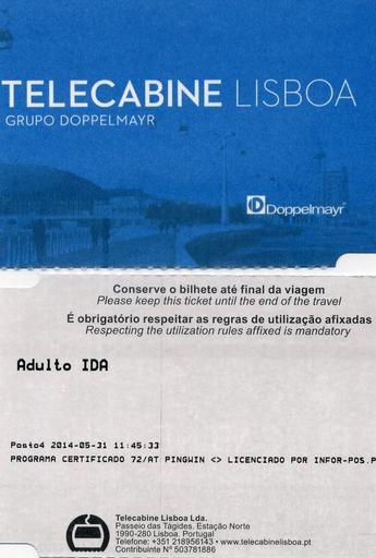 | Keywords: Lisboa Telecabine ticket 2014-05-31 01 @chesi.jpg Portugal The ticket for the Nations Park Gondola Lift aerial transportation by cable located in Lisbon Own from scan Piergiuliano Chesi 2014-06-16 trademarked Public transport tickets of Portugal Teleférico da Expo |