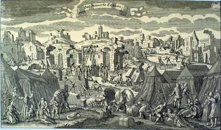 Keywords: Lisbon1755hanging.jpg 1755 German copperplate image The Ruins of Lisbon Survivors camp in a rather fanciful tent city outside the city of Lisbon following the November 1 1755 earthquake The image shows criminal activity and general mayhem as well as the hanging of quake survivors under constabulary supervision Priests are present one holding a crucifix one possibly a prayer book so appear to be giving last rites to persons being hanged Courtesy of the National Information Service for Earthquake Engineering NISEE University of California Berkeley with permission permitted under the terms of non-profit sharing agreement Jan Kozak collection Original in Museu da Cidade Lisbon also reproduced in O Terramoto de 1755 Testamunhos Britanicos The Lisbon Earthquake of 1755 British Accounts Lisbon British Historical Society of Portugal 1990 en wikipedia 2005-02-17 Sandover wikipedia en PD-old original upload log page en wikipedia Lisbon1755hanging jpg 2005-02-17 20 23 Sandover 800×471×8 138612 bytes <nowiki>1755 German copperplate image The Ruins of Lisbon showing criminal activity and the hanging of quake survivors</nowiki> Earthquakes in art Lisbon earthquake of 1755 Anointing of the Sick Catholic Church |