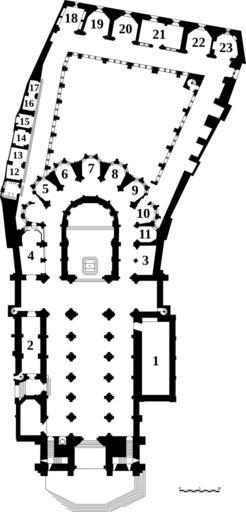 | Keywords: Lisbon cathedral annotated map.svg en Annotated map of Sé de Lisbon fr Plan légendé de la cathédrale de Lisbonne en français Português - 1 Sacristie Sacristia - 2 Camarim do Patriarca - 3 Chapelle de Saint Vincent Capela de S Vincente - 4 Chapelle du Saint Sacrement Capela do Santissimo Sacramento - 5 Chapelle de la Sainte Trinité Capela da Santíssima Trindade - 6 Chapelle de Sainte Anne Capela de Santa Ana - 7 Antigo Cartório - 8 Chapelle de Saint Ildefonse Capela de Santo Ildefonso - 9 Chapelle de Saint Côme et de Saint Damien Capela de S Cosme e S Damião - 10 Capelle de Notre-Dame de la Pitié Capela de Nossa Senhora da Piedade - 11 Chapelle de Saint Sébastien Capela de S Sebastião - 12 Chapelle de Saint Jean l'évangéliste Capela de S João Evangelista - 13 Chapelle de Saint Laurent Capela de S Lourenço - 14 Chapelle de Notre-Dame de Belém Capela de Nossa Senhora de Belém - 15 Chapelle du Seigneur Jésus de Bonne Sentence Capela do Senhor Jesus da Boa Sentença - 16 Chapelle de Saint-Antoine de Padoue Capela de Santo António de Pádua - 17 Chapelle de Notre-Dame de Tocha Capela de Nossa Senhora da Tocha - 18 Chapelle de Saint Aleixo Capela de Santo Aleixo - 19 Chapelle de Saint Miguel et Almas Capela de S Miguel e Almas - 20 Primitiva Irmandade da Misericórdia - 21 Primitiva Irmandade da Misericórdia - 22 - 23 Sépulture de Estavão Rodrigues et de Mór Martins Sepulturas de Estavão Rodrigues e Mór Martins - Added numbers for annotation Pethrus Lisbon_cathedral_map svg atelier graphique PD-old original upload log This image is a derivative work of the following images File Lisbon cathedral map svg licensed with PD-old 2010-03-01T12 01 25Z Pethrus 1221x2541 121482 Bytes <nowiki>Color correction</nowiki> 2010-02-28T23 23 17Z Pethrus 1221x2541 94378 Bytes <nowiki> en Map of Sé de Lisbon fr Plan de la cathédrale de Lisbonne pt Mapa da Sé de Lisboa 2010-02-28 23 20 UTC File Igrej</nowiki> Uploaded with derivativeFX SVG buildings Plans of Sé de Lisboa |