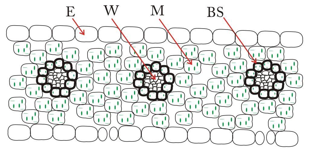 MAKE A MEME View Large Image Lisc c4.svg en Anatomy of C<sub>4</sub> plant leaf E Epidermis; M Mesophyll cells; W Xylem/Phloem; Schematischer Querschnitt eines Blattes einer C4-Pflanze E Epidermis; M Mesophyllzelle; W Xylem/Phloem; BS Bündelscheidenzelle Auf der ...