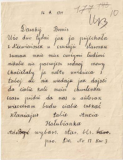 | Keywords: List Hanny Halubianki.jpg  Branisłaŭ Taraškievič written in Belarusian Łacnika 1919 Б аніслава Та ашкевіча напісаны лацінкай 1919 год Belarusian state archive-museum of literature and art http //lacinka wordpress com/2010/03/12/list-hanny-halubiankі-da-branislava-taraskievica/; got from Andranik Antanian Бела ускі дзя жаўны а хіў-музэй літа ату ы і мастацтва БДА Л ф 3 воп 1 адз зах 227 а к 10 http //lacinka wordpress com/2010/03/12/list-hanny-halubiankі-da-branislava-taraskievica/ Ат ымана п аз Анд аніка Антаняна Hanna Hałubianka / Ihnat Kančeŭski 1919 Belarusian Latin alphabet Branisłaŭ Taraškievič PD-old |