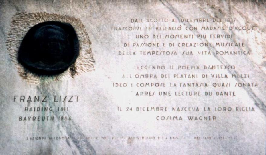 | Keywords: Liszt.jpg  en Franz Liszt in Bellagio Italy it Franz Liszt a Bellagio own è una mia foto Nicolago ~ 2000 <center> FRANZ LISZT Raiding 1811 Bayeruth 1886 Dall ™agosto al dicembre del 1837 trascorse in Bellagio con madame d'Agoult uno dei momenti più fervidi di passione e di creazione musicale della tempestosa sua vita romantica leggendo il poema dantesco all ™ombra dei platani di villa Melzi ideò e compose la fantasia quasi sonata Apres une lecture du Dante il 24 dicembre nasceva la loro figlia Cosima Wagner L ™Azienda autonoma Bellagio </center> Plaques of Franz Liszt Plaques in Bellagio Lake Como Cosima Wagner Richard Wagner Here-worked plaques in Italy Here-lived plaques in Italy Plaques referencing 1837 ImageNote 1 63 30 899 515 985 574 2 <center> FRANZ LISZT Raiding 1811 Bayeruth 1886 Dall ™agosto al dicembre del 1837 trascorse in Bellagio con madame d'Agoult uno dei momenti più fervidi di passione e di creazione musicale della tempestosa sua vita romantica leggendo il poema dantesco all ™ombra dei platani di villa Melzi ideò e compose la fantasia quasi sonata Apres une lecture du Dante il 24 dicembre nasceva la loro figlia Cosima Wagner L ™Azienda autonoma Bellagio </center> ImageNoteEnd 1 |